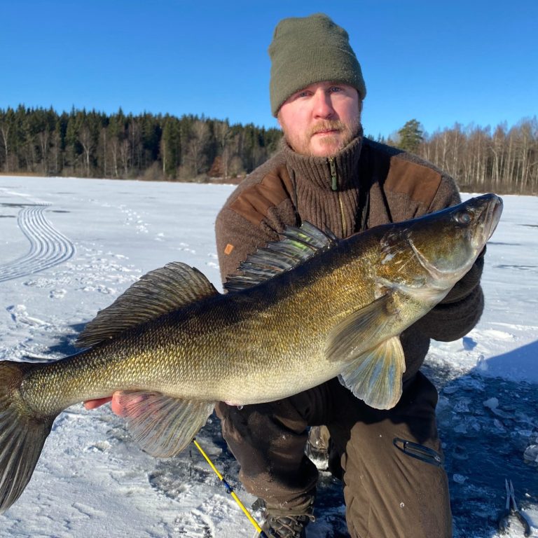 På bilden vid sidan kan du se Carl Johansson som i februari förra året fick upp denna fina gös på 5.250 gr. Fiskemetod ismete. Gösen återsläpptes Samma dag fick Carl även upp tre abborrar som vägde mellan 1 kg och 1,4 kg, även dessa på ismete.